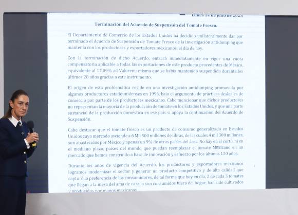 “Repito nuevamente: el mayor impacto va a ser para Estados Unidos, porque es muy difícil sustituir el jitomate mexicano, es decir, se va a seguir exportando. Para el porcentaje que pueda tener efectos, estamos trabajando con los productores para distintas opciones dentro del Plan México que ya las anunciamos en su momento”, dijo.
