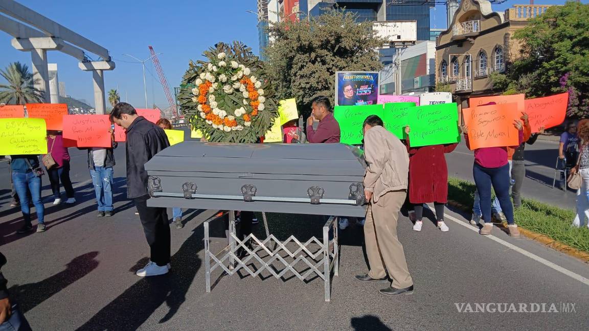Ciudadanos protestan en Monterrey sobre la avenida Constitución con ataúdes y coronas florales, exigiendo a las aseguradoras el pago de pólizas tras accidentes viales.