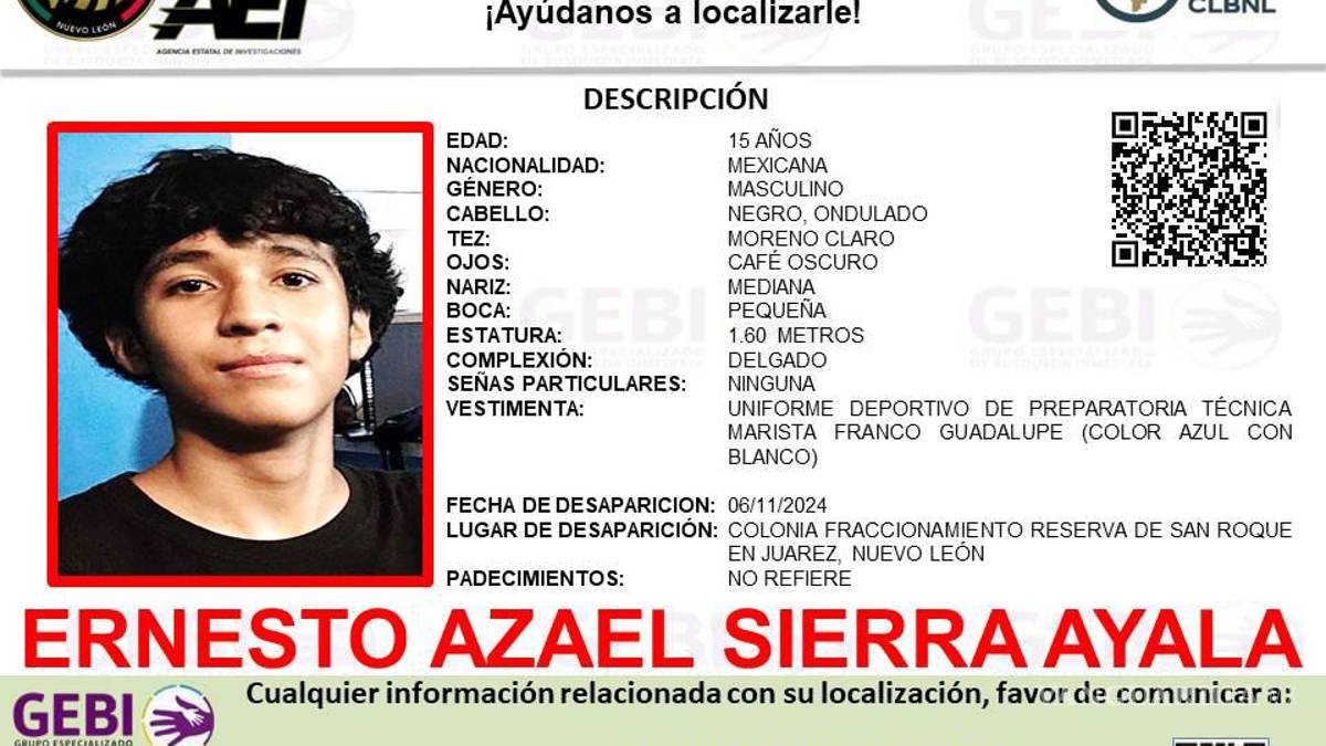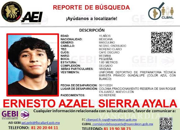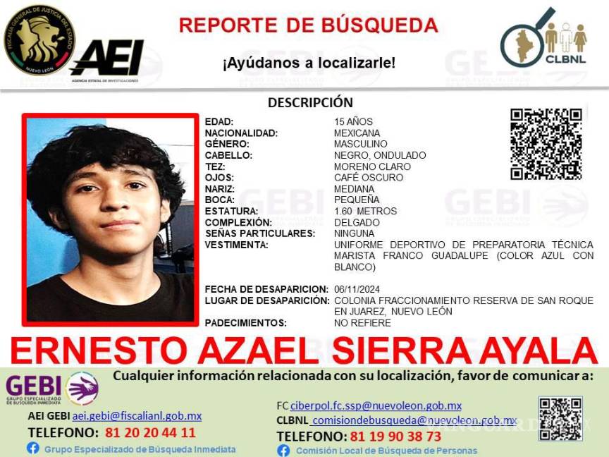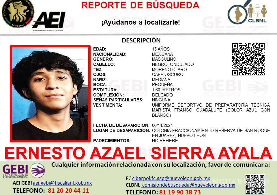 Monterrey, Nuevo León.- Las autoridades de Nuevo León emitieron un reporte de búsqueda para dar con el paradero de un joven de 15 años, quien desapareció cuando se dirigía a la preparatoria en donde cursa sus estudios en el municipio de Juárez.