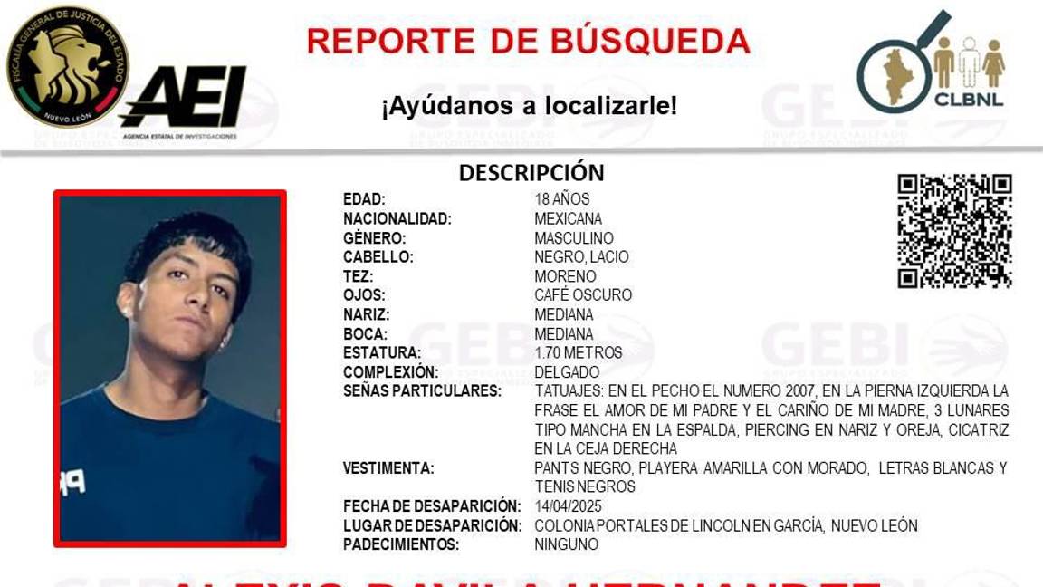 MONTRREY, NL.- Tres jóvenes de 16 y 18 años de edad, se encuentran desaparecidos desde el pasado 14 de abril, cuando fueron vistos por última ocasión en calles de la colonia Portal de Lincoln, en el ayuntamiento de García, Nuevo León.