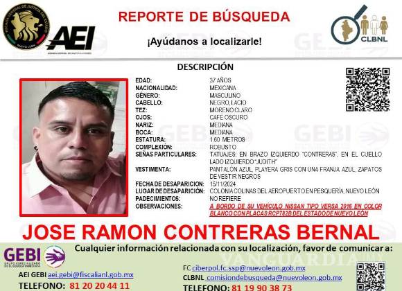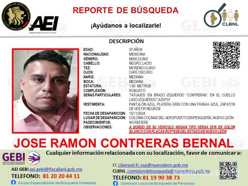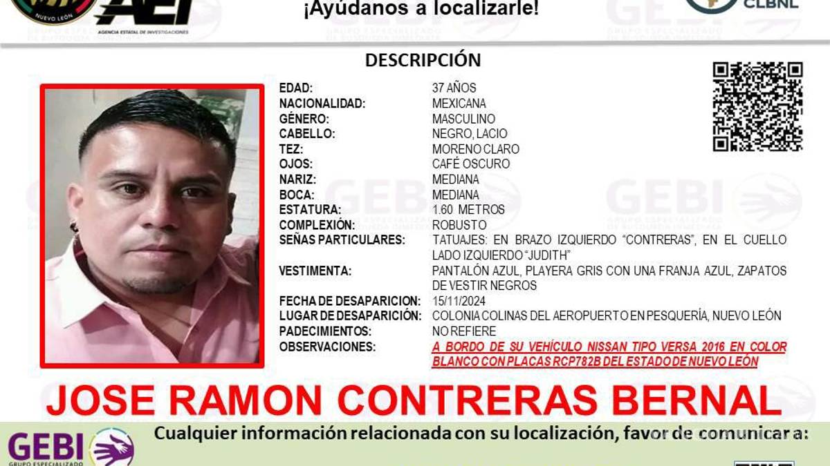 José Ramón Contreras Bernal desapareció el 15 de noviembre cuando salió de su domicilio en la colonia Colinas del Aeropuerto a bordo de su vehículo Nissan Versa 2016 en color blanco con placas de circulación RCP 782B del estado de Nuevo León.