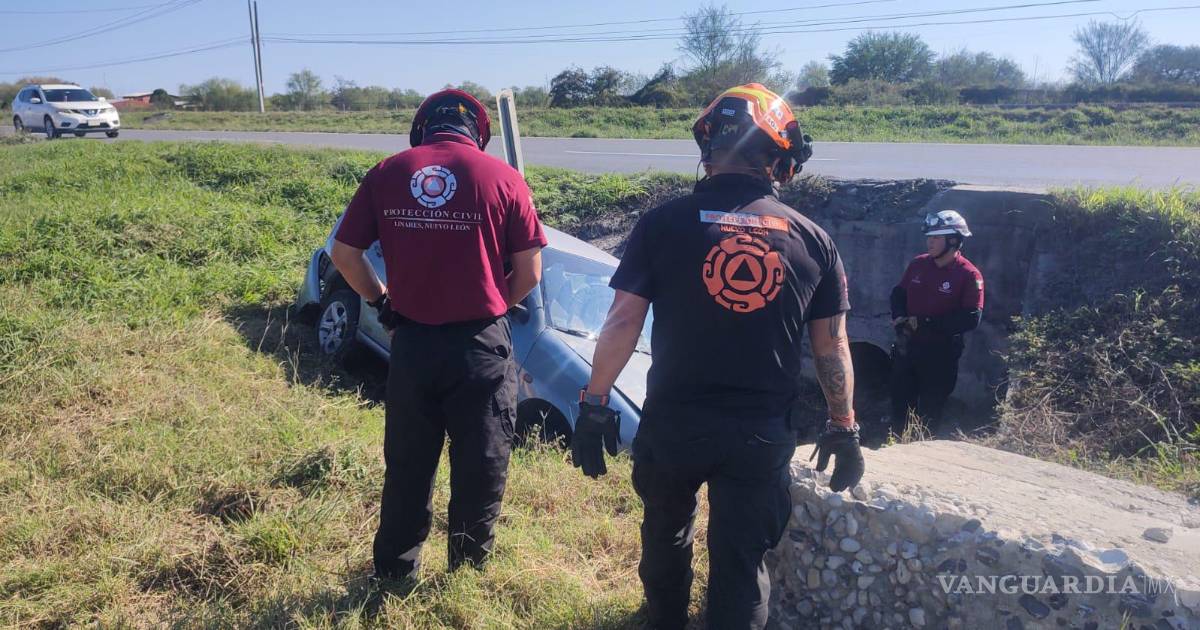 Una automovilista perdió el control y se salió del camino por lo que terminó en un paso de agua, en Linares, Nuevo León, sin reporte de lesionados.
