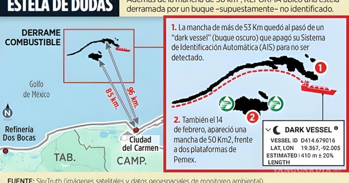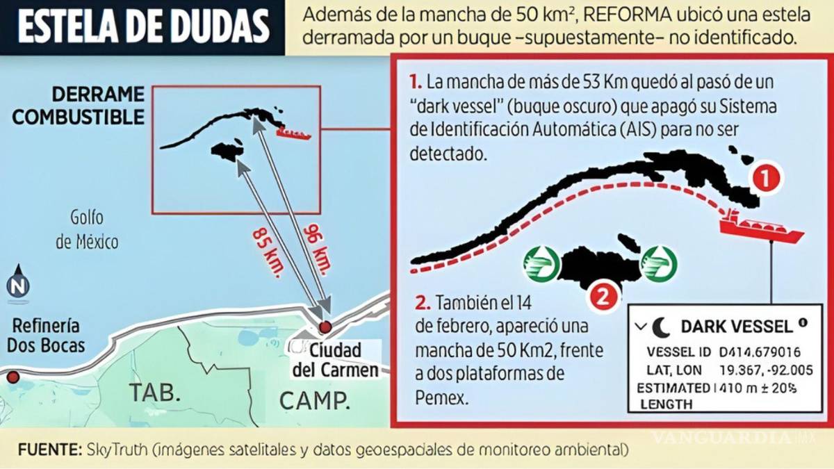 La operación de un buque con su sistema de identificación apagado, similar a las acciones de barcos que roban combustible, fue detectada en la Sonda de Campeche, junto a un derrame extendido, desde el 14 de febrero por la plataforma SkyTruth.