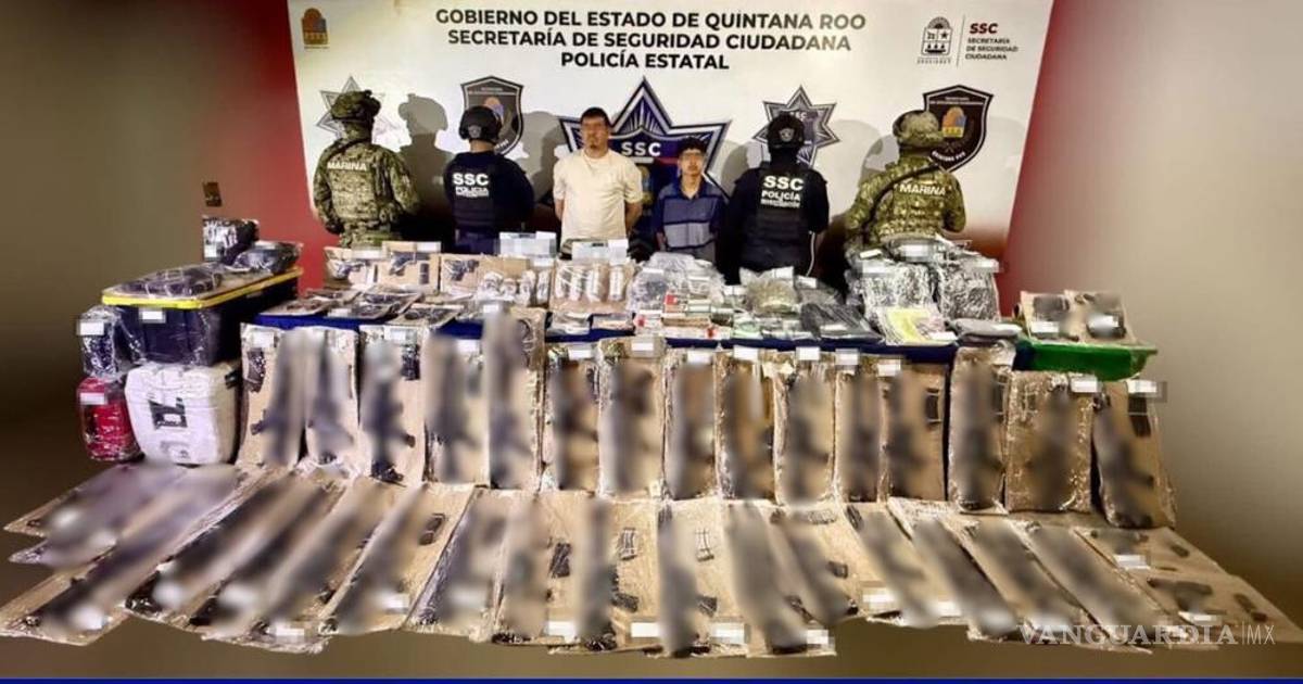 Asimismo, se aseguraron dos armas cortas con cargadores abastecidos con 7 y 11 cartuchos, respectivamente; 32 armas largas, todas con cargador, de las cuales una estaba abastecida con 56 cartuchos y otra con 30; además, 12 armas cortas con su cargador; 125 cargadores de arma larga; dos silenciadores; cuatro granadas antimotín y cuatro granadas químicas; 26 cajas de cartuchos de diferentes calibres con 50 cartuchos cada una; 17 cajas con 20 cartuchos cada una; nueve chalecos antibalas; nueve playeras negras con la leyenda “Deltas Q. Roo CJNG”; 15 gorras negras “Operativas Jaguar”; y seis parches “Deltas Operativo Jaguar”.