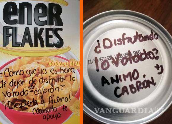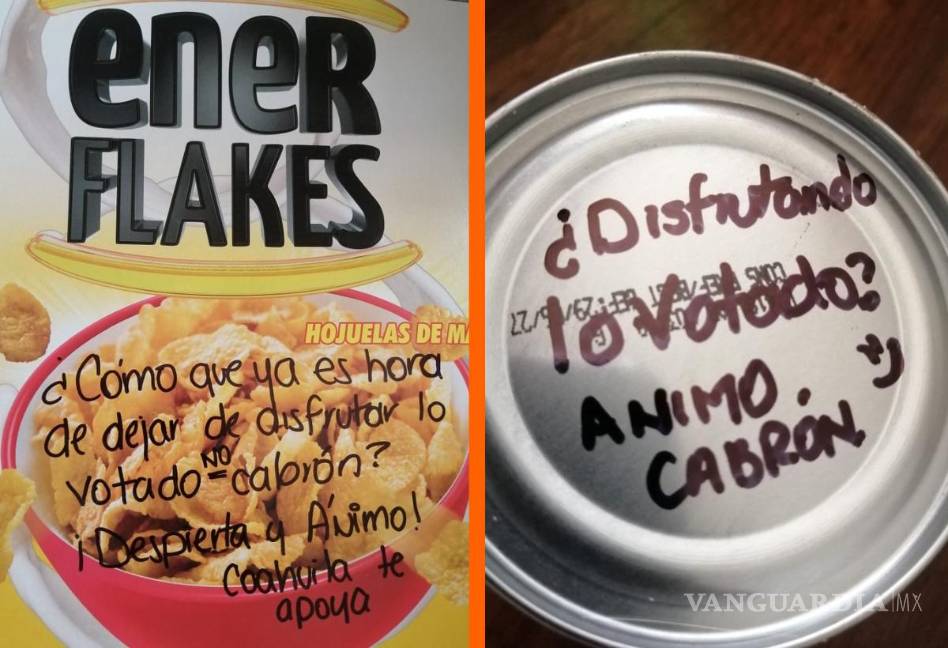 “Y deja de disfrutar lo votado! Animo”, “¡Ánimo y suelta lo votado! Despierta”, aparecen en otros productos como champú y sereal.