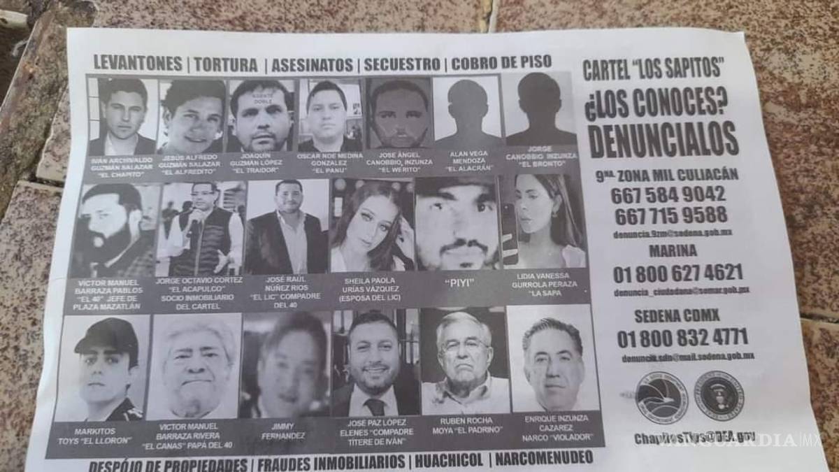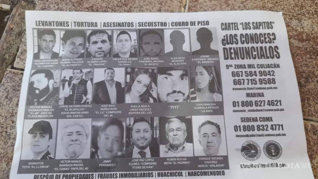 El volante muestra caras conocidas como la de Iván Archivaldo Guzmán Salazar, Jesús Alfredo Guzmán Salazar y Joaquín Guzmán López, todos hijos del capo de la droga, Joaquín ‘El Chapo’ Guzmán Loera y hermanos de Ovidio ‘El Ratón’ Guzmán López. Incluyendo al gobernador de Sinaloa, Rubén Rocha Moya, el senador Enrique Inzunza Cázarez y el alcalde de Badiraguato, José Paz López Elenes.