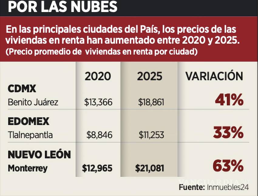 Un informe de la plataforma reveló que las ciudades de Monterrey, Ciudad de México y la zona conurbada del Estado de México reportaron rentas superiores a los 24 mil, 17 mil y 12 mil pesos, respectivamente.