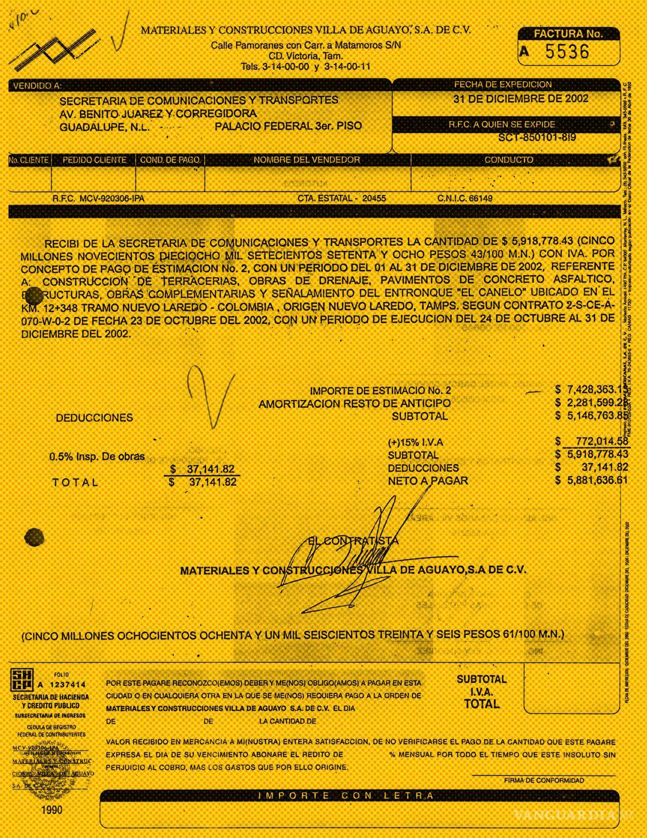 En segundo puesto, con 559 millones de pesos en contratos, figura Materiales y Construcciones Villa de Aguayo, una empresa tamaulipeca que acabó involucrada en un juicio por lavado de dinero iniciado en Texas contra el exgobernador de Tamaulipas Tomás Yarrington.