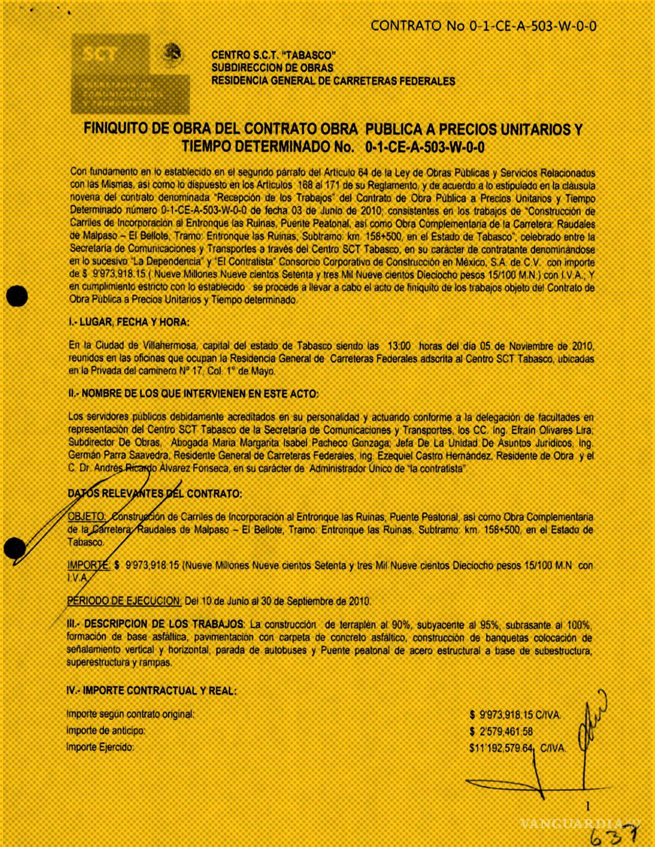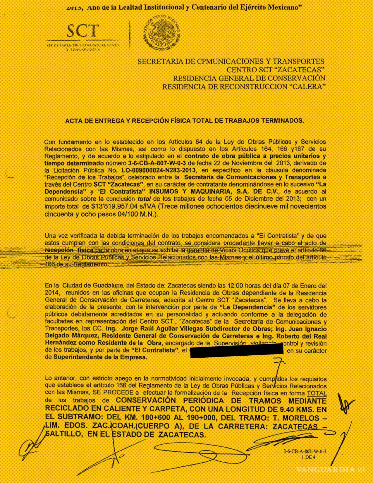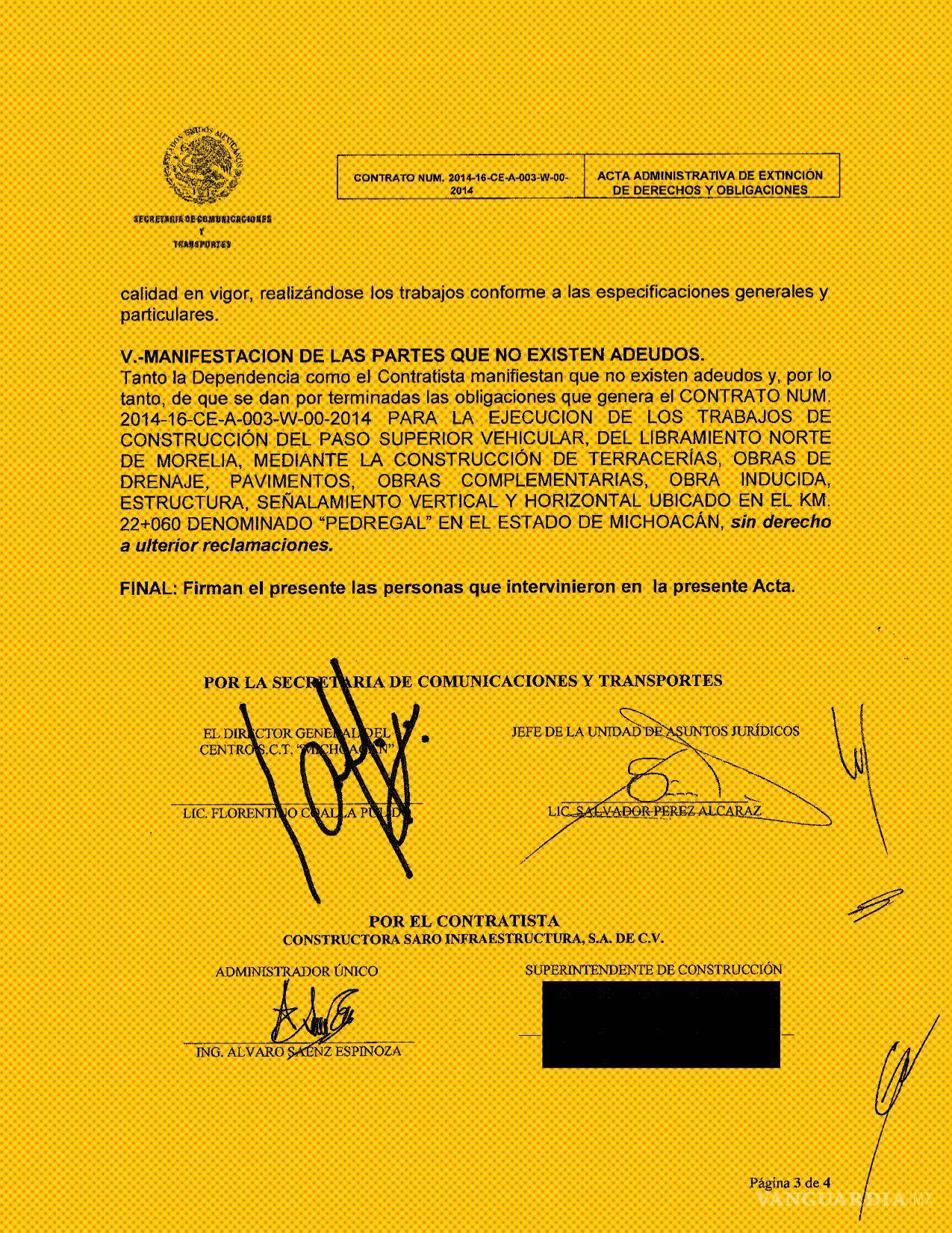 De ambos contratos la SICT expidió a Saro Infraestructura las actas de extinción de derechos y obligaciones que amparaban el cumplimiento de la compañía “en tiempo y forma”, conforme a “las normas de calidad” y “las especificaciones generales y particulares”.