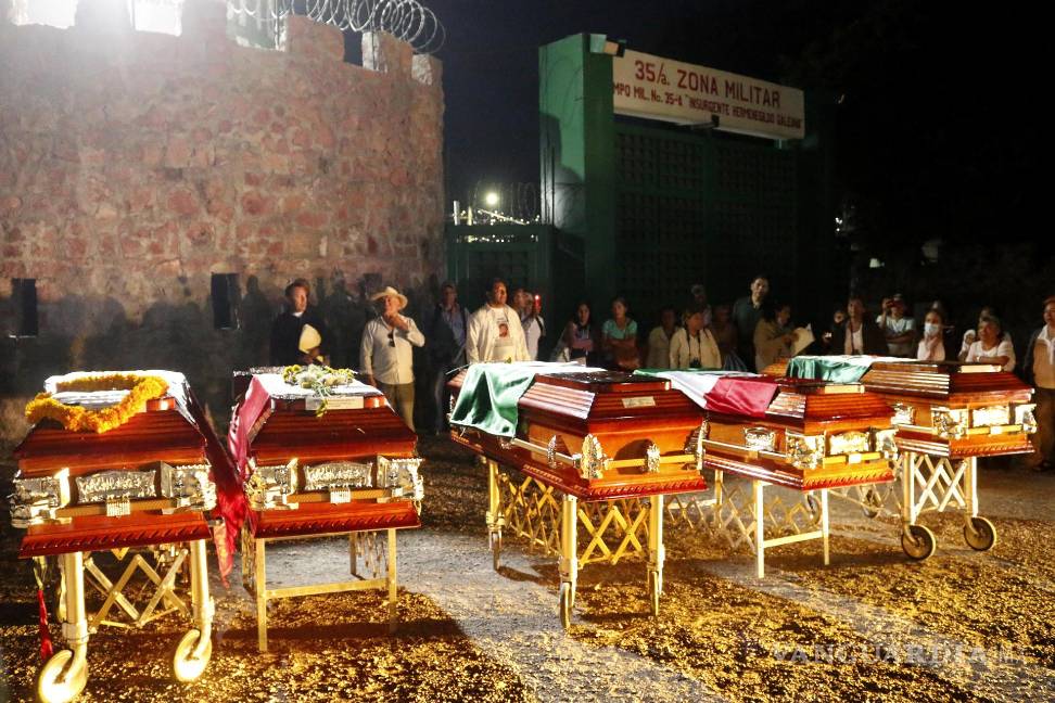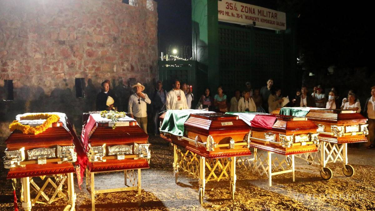 CHILPANCINGO- Familiares de cinco hombres asesinados en la época de la llamada ‘Guerra Sucia’ en México protestaron con sus restos en féretros la noche de este viernes afuera de la 35 Zona Militar de Chilpancingo, capital del sureño estado de Guerrero, para exigir justicia, pues señalan al Ejército mexicano de responsable.