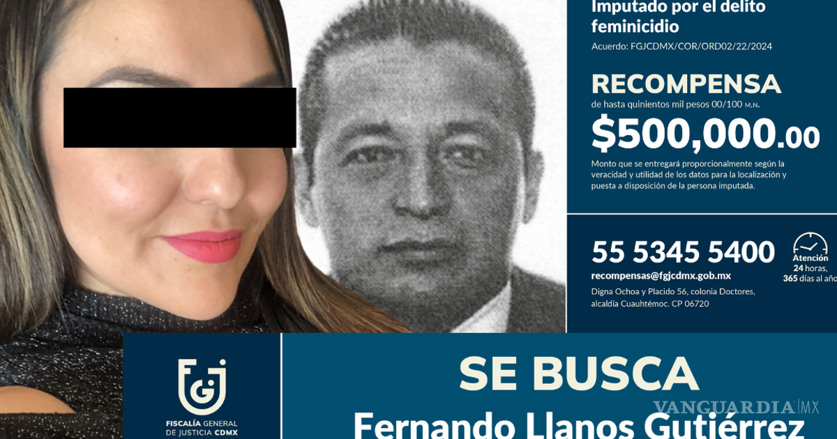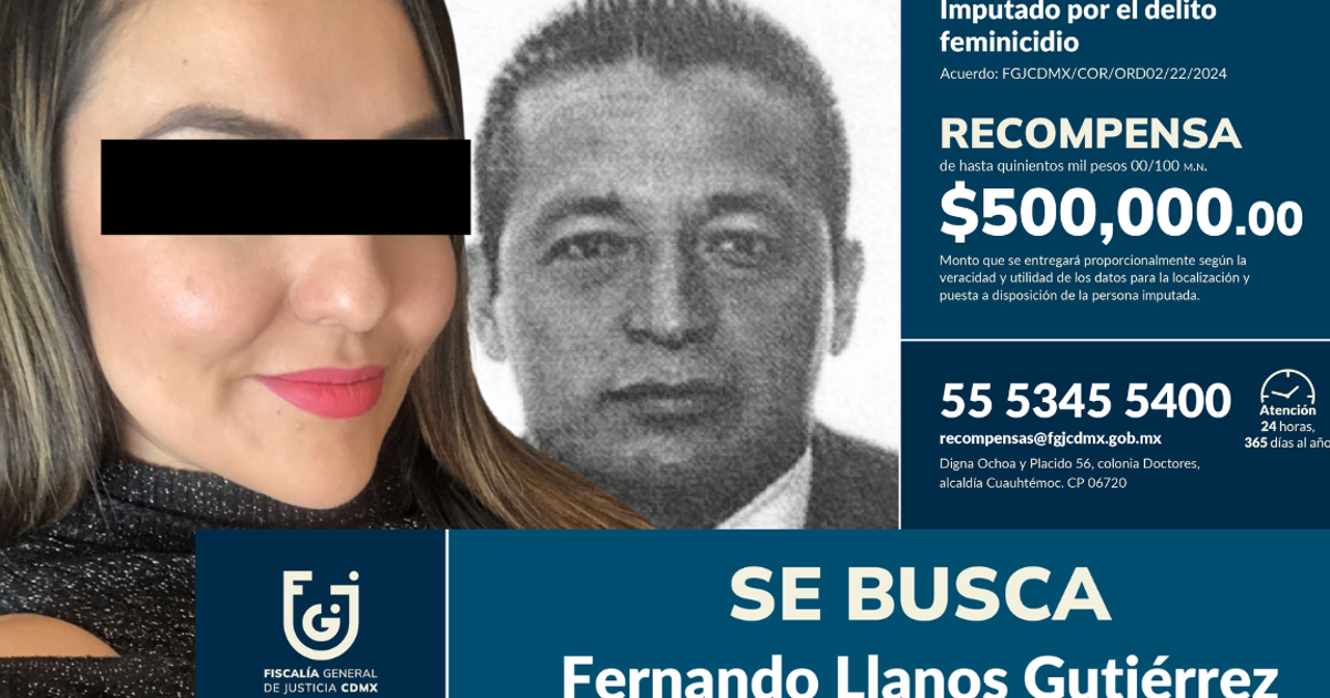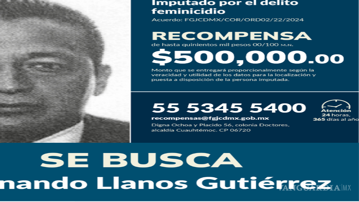 La Fiscalía General de Justicia de la Ciudad de México (FGJCDMX) anunció una recompensa de hasta 500 mil pesos para quien aporte información veraz y útil que contribuya a la localización de Fernando Llanos Gutiérrez, señalado como imputado por el delito de feminicidio y prófugo desde 2019.