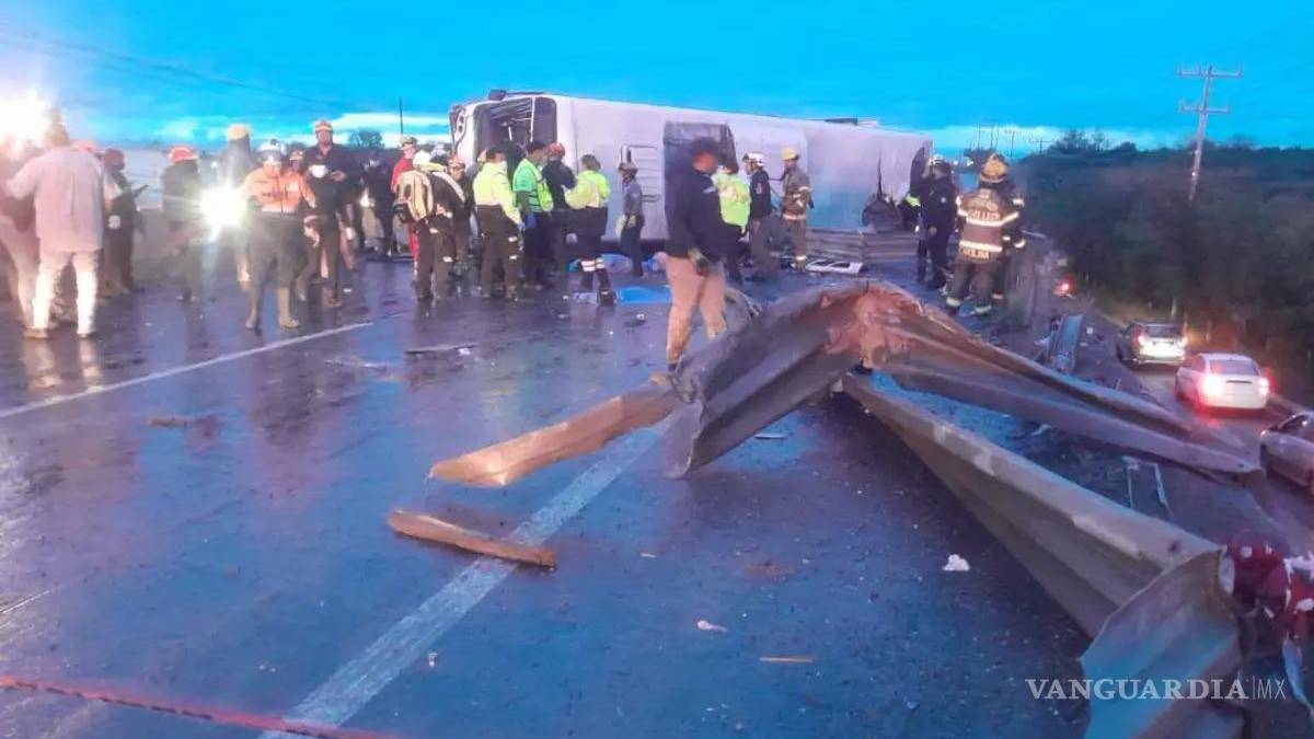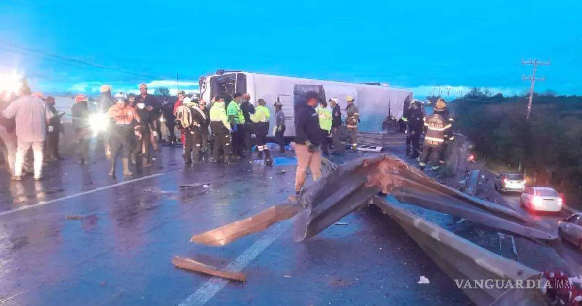 Ocho personas murieron y 61 resultaron lesionadas tras la volcadura de un camión de la Ruta 611-Pesquería en Apodaca; de los heridos, 33 ya fueron dados de alta y uno permanece grave en cuidados intensivos, informó el Instituto Mexicano del Seguro Social (IMSS).