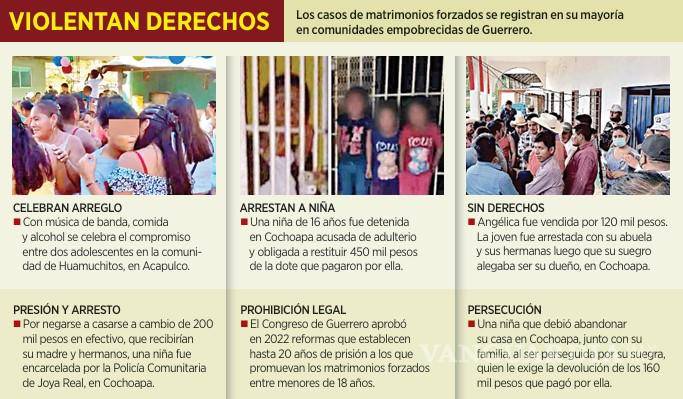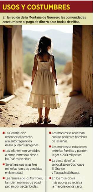 Grupo REFORMA reportó el caso de una niña de 16 años que fue encarcelada cuatro días por una supuesta infidelidad en Cochoapa, donde la policía comunitaria obligó a que la familia de la menor se comprometiera a devolver 450 mil pesos de la dote que pagaron los padres del esposo.
