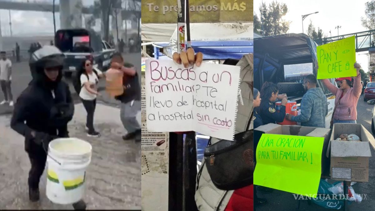 Una de las fotografías que se viralizó muestra a una persona con una mesa que ofrecía pan y café gratis a quienes aguardaban información sobre familiares lesionados. En otra imagen se observa un contenedor con botellas de agua, alimentos y papel higiénico, acompañado de un letrero que dice: “Tómalo, es gratis”.