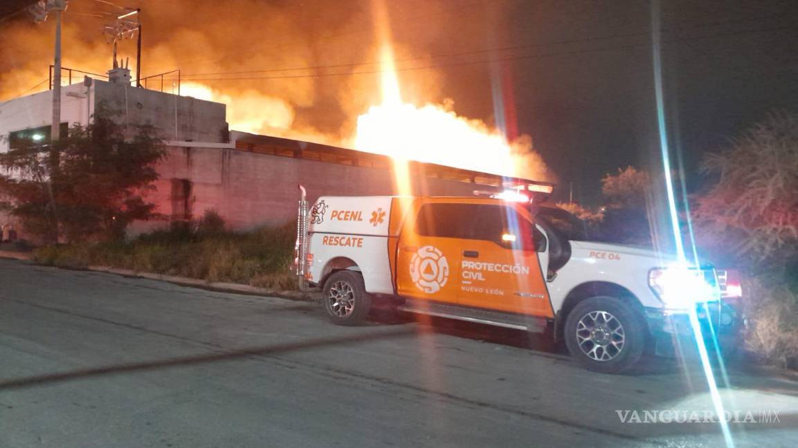 Monterrey, Nuevo León.- Un incendio en una bodega en la que se almacenan tarimas movilizó desde la madrugada de este jueves a elementos de distintas corporaciones de Protección Civil, en Salinas Victoria, Nuevo León.