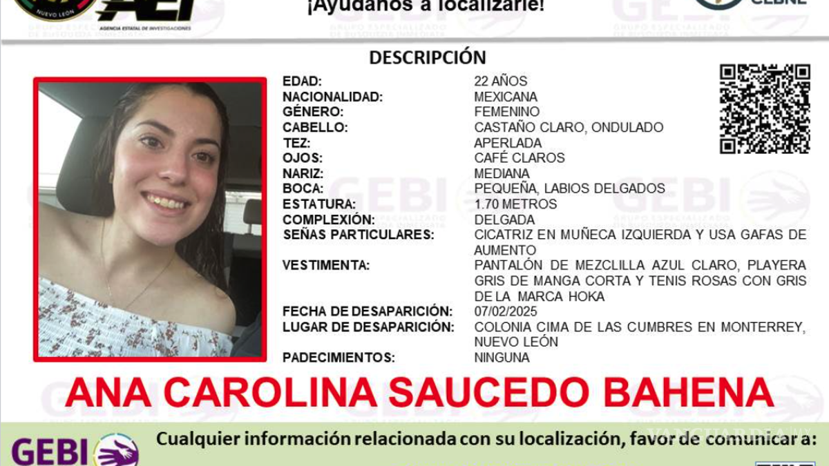 Las autoridades piden llamar al 81 20 20 44 11, si alguien tiene información respecto al paradero de Ana.