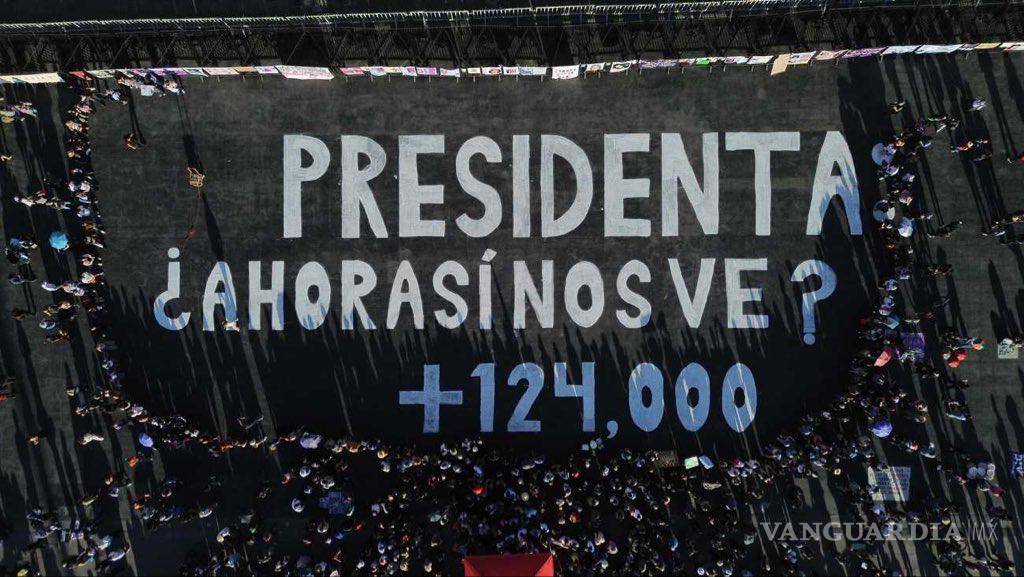 La pinta, también, destaca: “Presidenta, ¿ahora sí nos ve?”, acompañada de la cifra de más de 124 mil personas desaparecidas en el país.