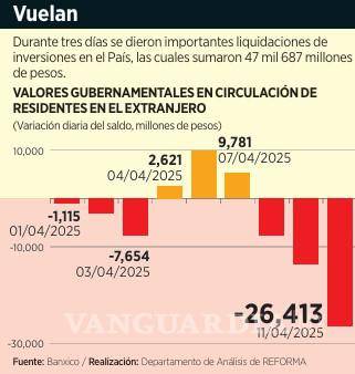 Sólo el 11 de abril salieron del País 26 mil 413 millones de pesos, en reacción al anuncio por parte del Gobierno estadounidense de pasar de 125 a 145 por ciento el impuesto arancelario a China, mientras que hacía una pausa de 90 días para el resto de los países para dar cabida a las negociaciones.
