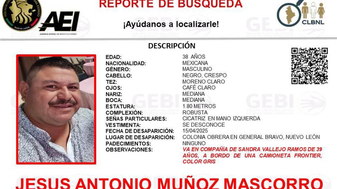 Los desaparecidos son: Sandra Vallejo Ramos, de 39 años de edad, y Jesús Antonio Muñoz Mascorro, de 38 años de edad.