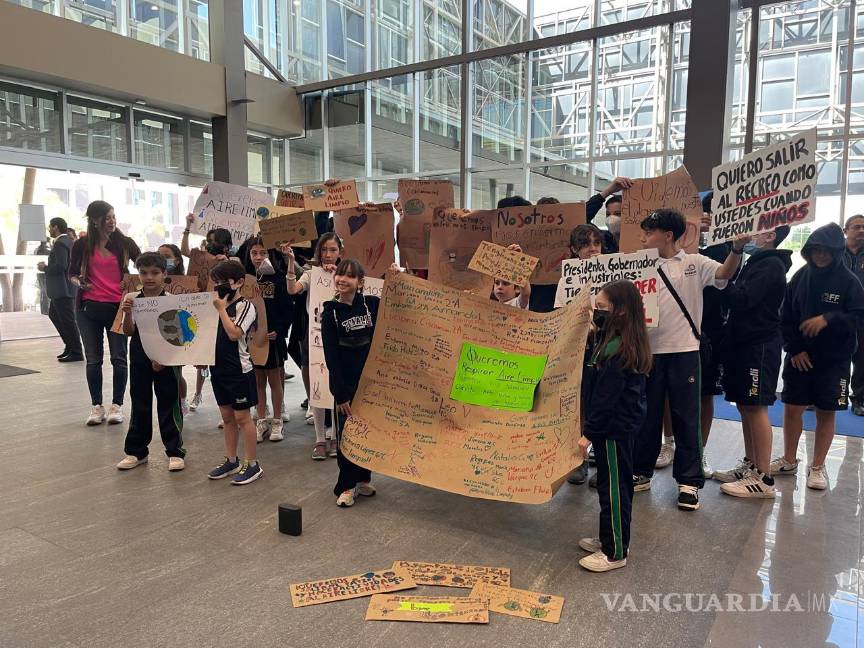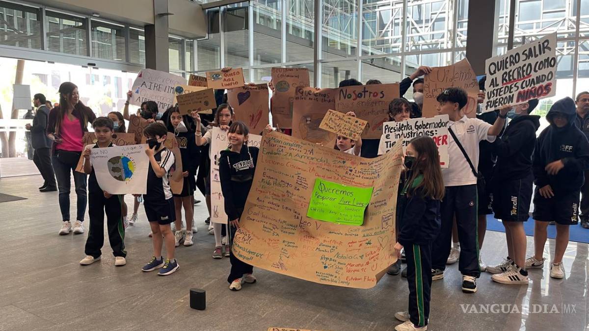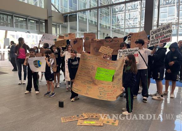 Por su parte, un grupo de estudiantes de primaria y secundaria se congregaron en Cintermex para exigir aire limpio a la presidenta.