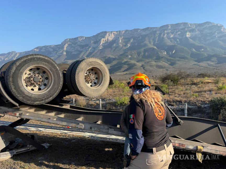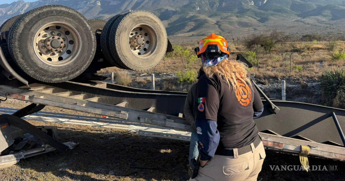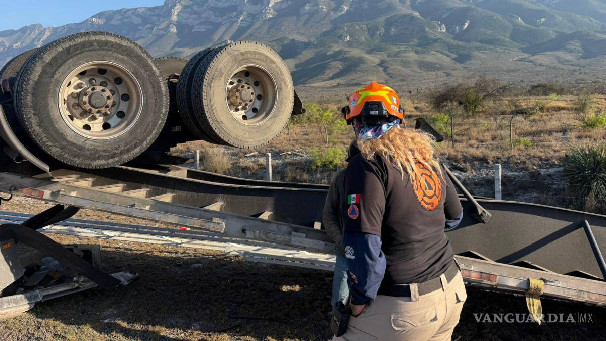 Un trailero logró salir ileso de la volcadura del tractocamión que conducía en la carretera Saltillo-Monterrey.