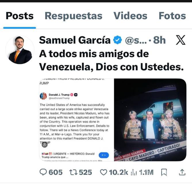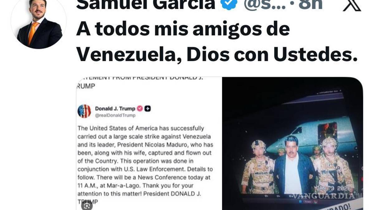 Usuario de X tundieron al gobernador de Nuevo León, Samuel García, por publicar una fotografía presuntamente falsa de la detención del presidente de Venezuela, Nicolás Maduro.