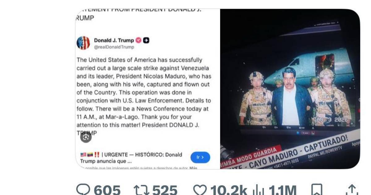‘Con todo respeto me parece que la emoción le ganó y publicaste contenido que no ha sido verificado. Busca la publicación de Donald Trump, no existe la foto de Maduro, es IA. Lo que sí es real son los bombardeos en Caracas’, indicó el usuario Bryan Mora.