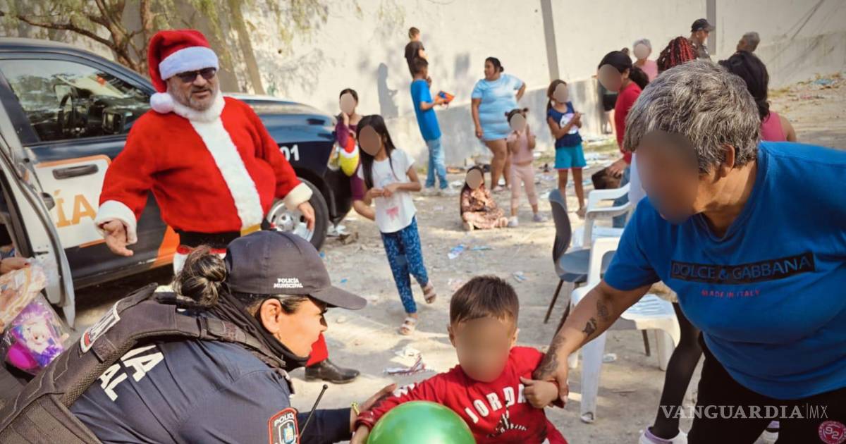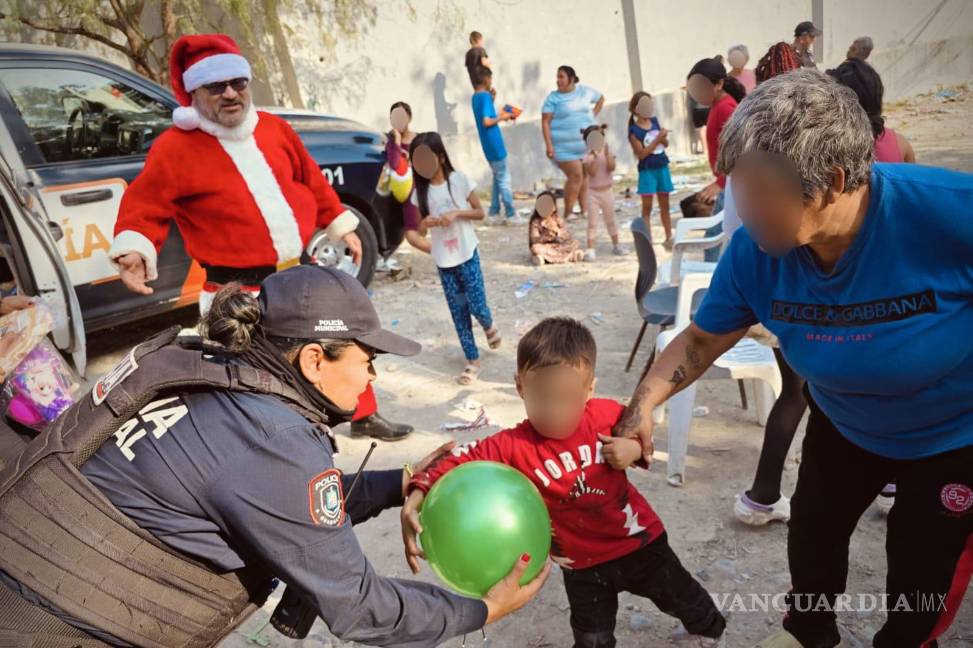 Monterrey, Nuevo León.- Siete policías del municipio de Guadalupe llevaron regalos y sonrisas a niños de escasos recursos en la colonia El Ranchito 1, en Nuevo León.