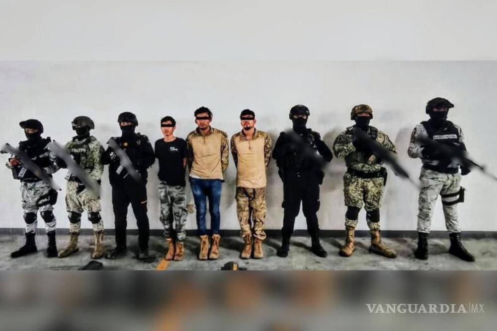 Tras una revisión les detectaron ropa táctica, chalecos antibalas, tres armas de fuego largas, dos cortas, piezas metálicas denominadas “ponchallantas”, dosis de narcótico compatible con marihuana y cristal, básculas digitales y dinero en efectivo.