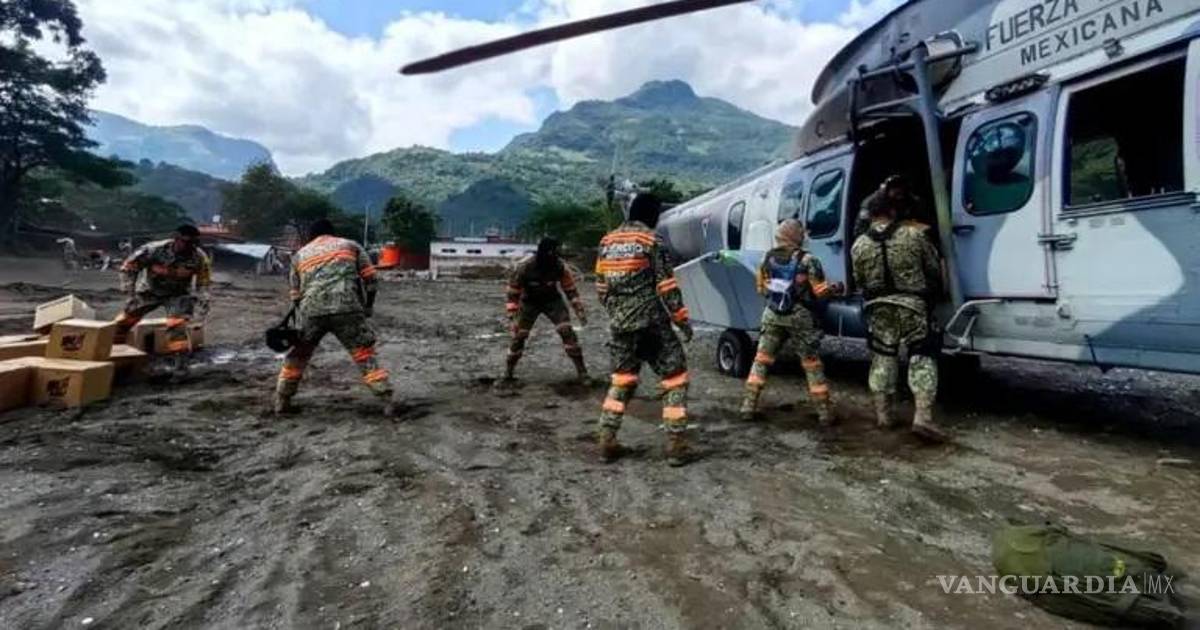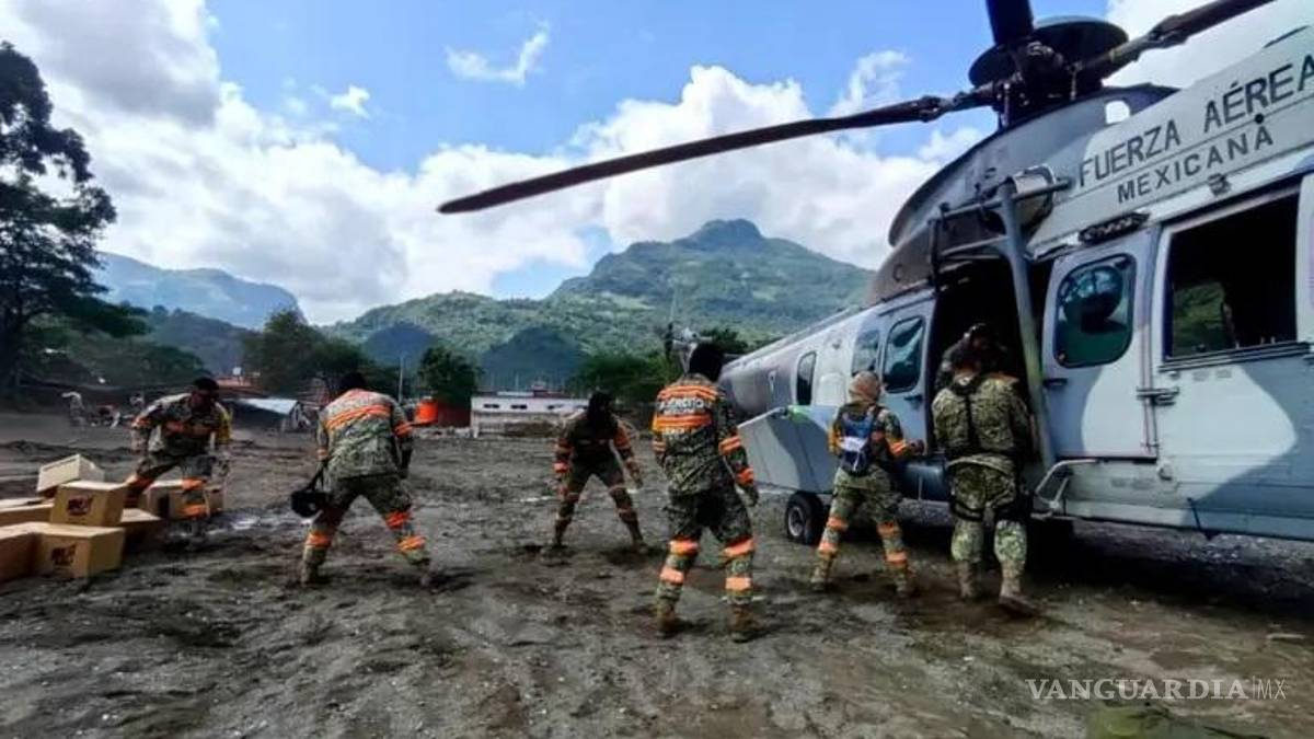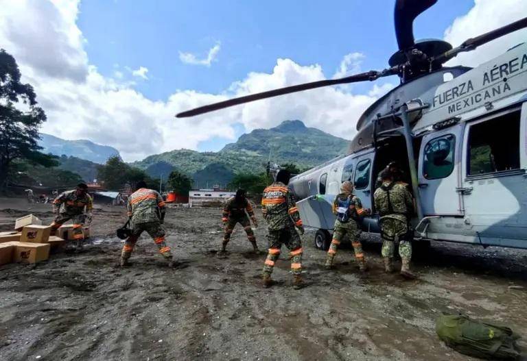 El operativo moviliza aeronaves del Ejército, la Fuerza Aérea Mexicana y la Guardia Nacional, que transportan víveres, agua, maquinaria pesada y apoyo médico hacia zonas de difícil acceso. Según imágenes oficiales, se utilizan al menos 21 helicópteros y bases de mando avanzadas en la región.
