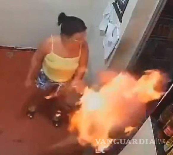 En las imágenes que circulan en redes sociales se puede ver a la mujer vertiendo alcohol sobre el cuerpo de la víctima y luego encendiendo un encendedor.