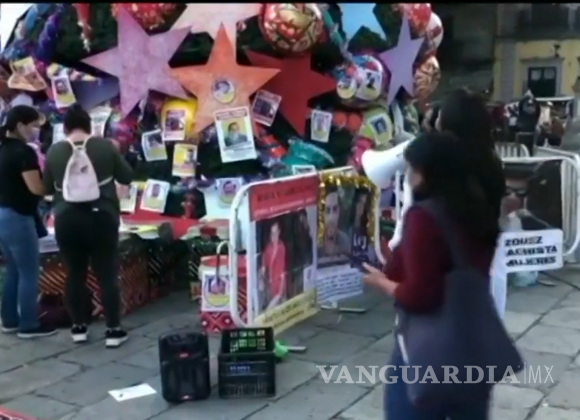 Mujeres levantan árbol de Navidad con rostros de padres deudores en Oaxaca