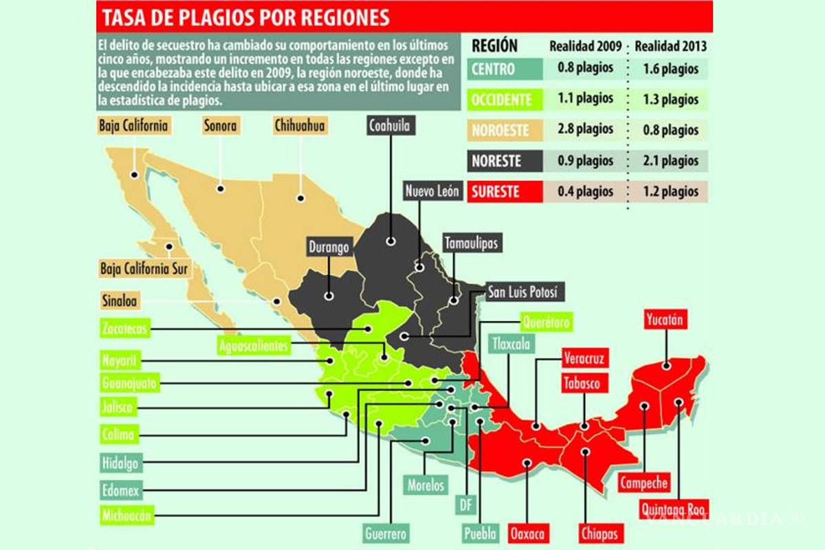 Los resultados arrojan un comportamiento diferenciado ya que la región noroeste compuesta por los estados de Baja California, Baja California Sur, Chihuahua, Sonora y Sinaloa, pasó de ser la de mayor incidencia de secuestro en el año 2009 a ser la de menor incidencia en 2013.