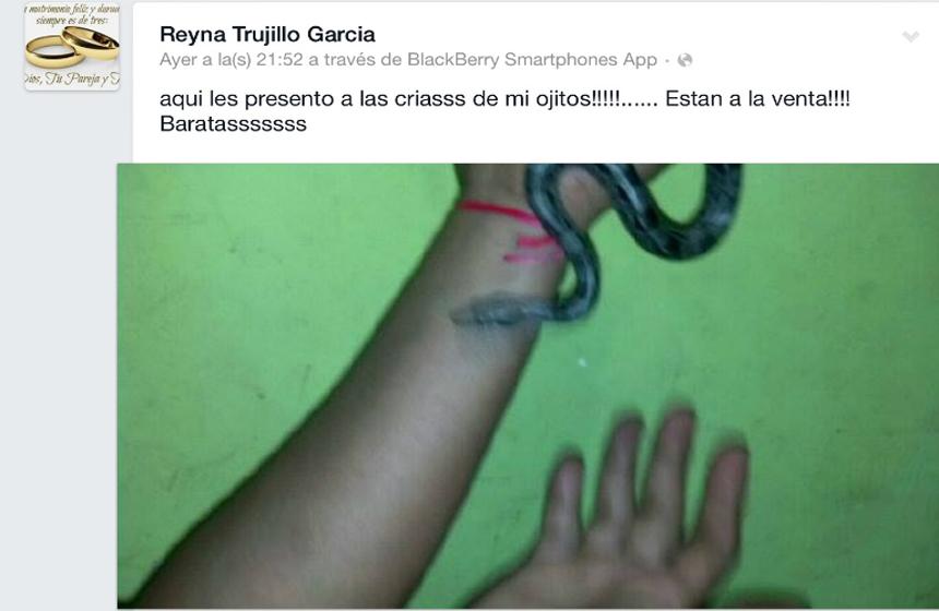 En sus publicaciones se muestran comentarios sobre la compra-venta de las boas, sobre todo de parte de la usuaria Christian T-Vaz, supuesta prima de la vendedora. Su perfil de Facebook ya fue eliminado pero ofertaba "bara bara" a los reptiles, además se leían comentarios en su muro como: "Ofertaaaaa!!!! Vendo crías recién nacidas de Boa Constrictor Emperador!!!!!!! Informes x in-box (sic)".