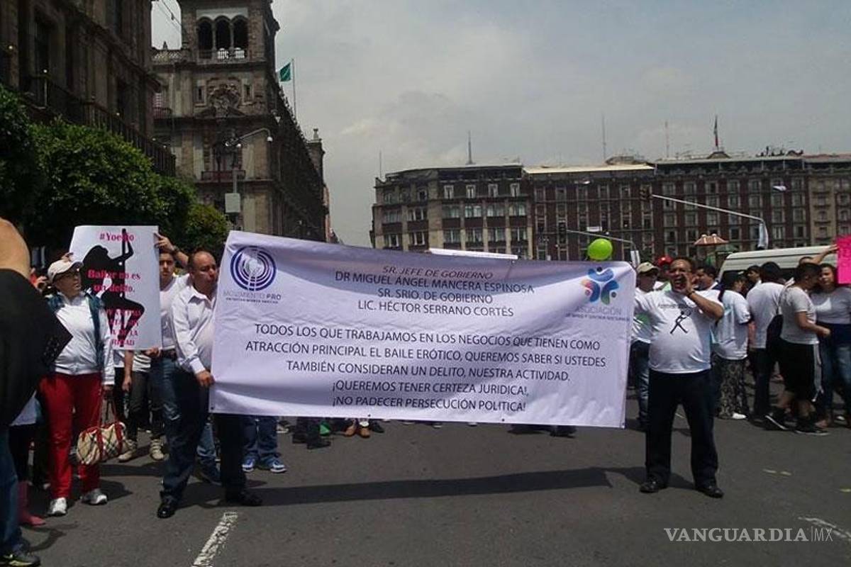 Ciudad de México.- Integrantes del Movimiento Pro Entretenimiento Erótico y de la Asociación de Bares y Centros Nocturnos se manifestaron en el Zócalo, en demanda de una respuesta del jefe de Gobierno capitalino, Miguel Ángel Mancera, y del secretario de Gobierno, Héctor Serrano, sobre el baile erótico como atracción principal en establecimientos de ese giro.
