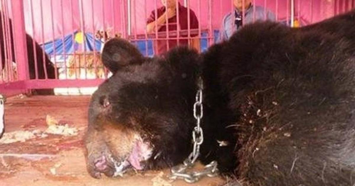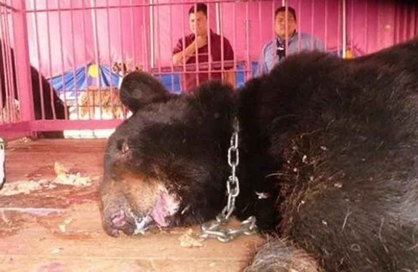 Brutales señales de violencia estaban registradas en un ejemplar de oso negro (Ursus americanus). Miky era su nombre artístico y solo tenia medio hocico, le extirparon la mitad del maxilar inferior y la dentadura superior, para evitar que no muerda o cause algún accidente en escena o entrenamientos.