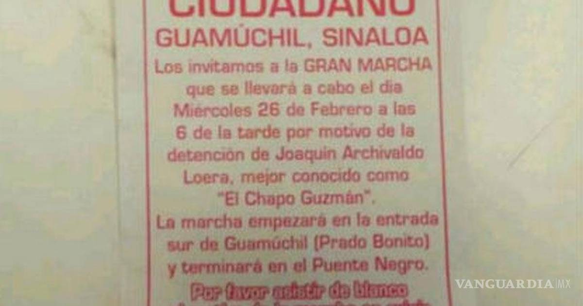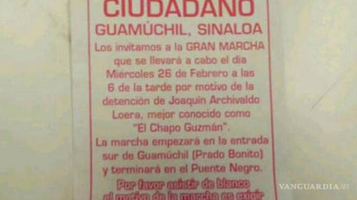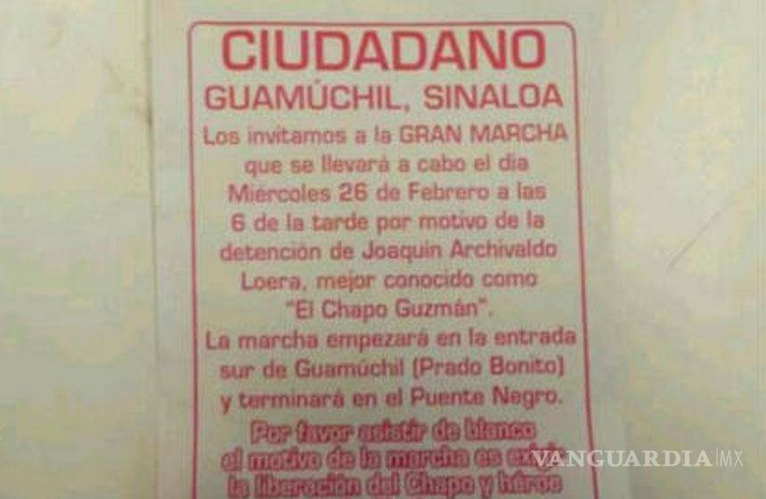 La marcha empezará en la entrada sur de Guamúchil (Prado Bonito) y terminará en el puente negro. Por favor asistir de blanco, el motivo de la marcha es exigir la liberación del Chapo y héroe de Sinaloa, reza el documento.