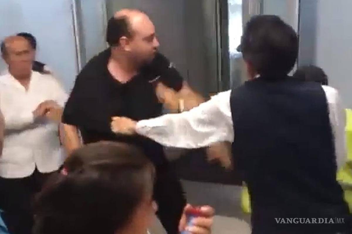 Acto seguido, el pasajero de camisa negra camina hacía el empleado (00:37) y lo golpea hasta que otro de los trabajadores interviene y los separa. "No te burles, cabrón, no te sigas burlando", continúa gritando el pasajero mientras que el empleado toma un teléfono celular.