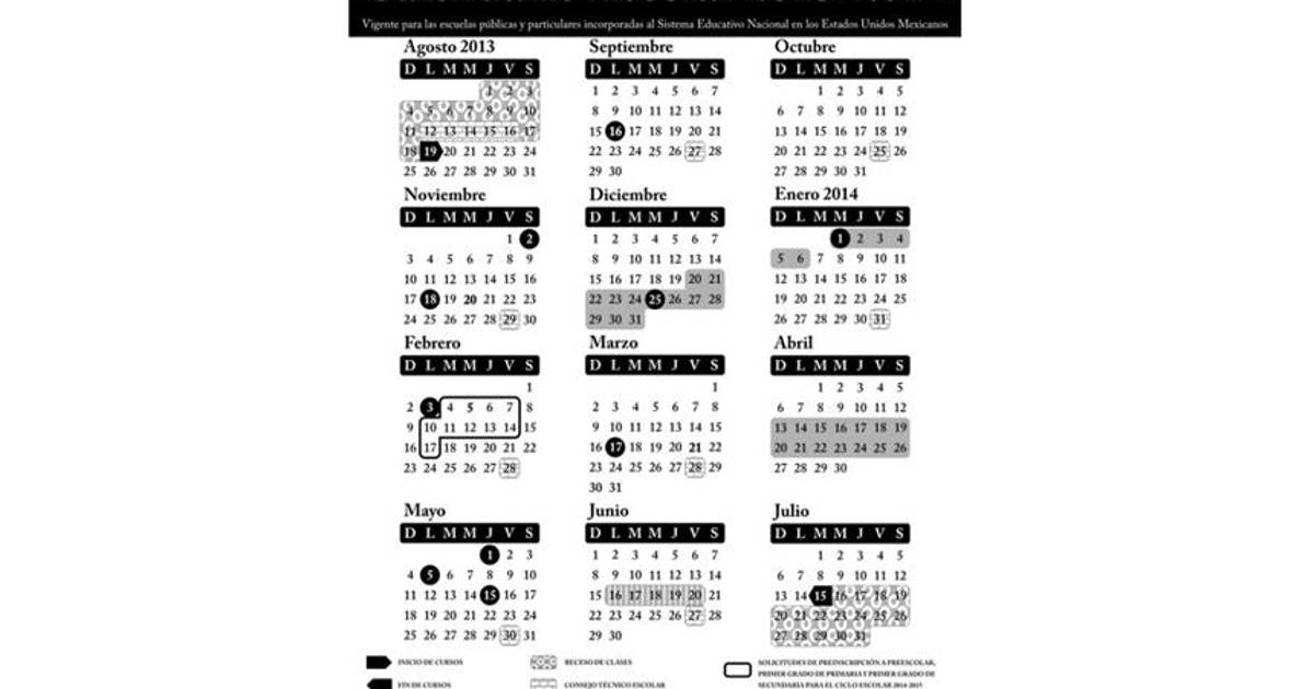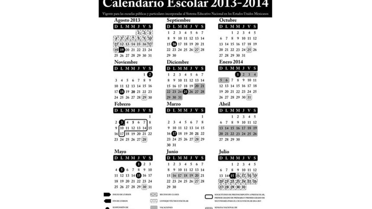 El calendario que será aplicable en las escuelas públicas y particulares de toda la República establece 200 días de clases, los cuales iniciarán el 19 de agosto de 2013 y concluirán el 15 de julio de 2014.