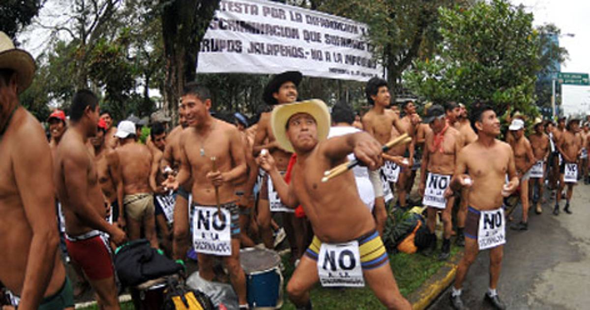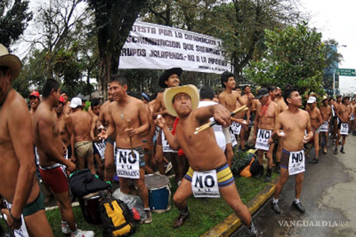 Campesinos semidesnudos protestan contra medios de comunicación en Xalapa