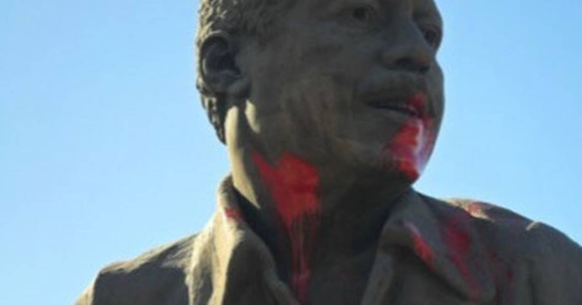 Los empleados del servicio de limpia municipal intentaban quitar la pintura roja que fue arrojada al busto de 3.5 metros de dimensión.
