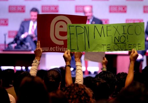 Peña Nieto fue cuestionado por los estudiantes, quienes en su mayoría le gritaban calificativos como "ladrón". "asesino", "incumplido" y "Atenco no se olvida" tambien aparecieron estudiantes con máscaras del ex-presidente Carlos Salinas de Gortari.