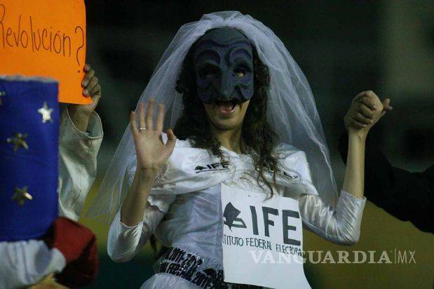 Los organizadores habían pedido que no se mostraran pancartas a favor o en contra de partidos políticos y candidatos; no obstante, los pobladores de San Salvador Atenco, quienes encabezan el contingente, portan una gran manta contra el candidato presidencial del Partido Revolucionario Institucional (PRI), Enrique Peña Nieto.
