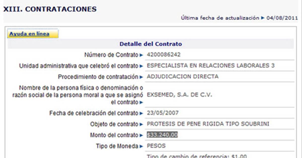 México, DF. Además de estar expuesta en el portal del IFAI, dicha compra aparece también registrada en la "Relación de proveedores" que prestaron alguna clase de servicio para la paraestatal en 2007. Con la diferencia de que en el IFAI el gasto que se muestra es de 33 mil 240 pesos y en el anexo de 201 mil 240 pesos.