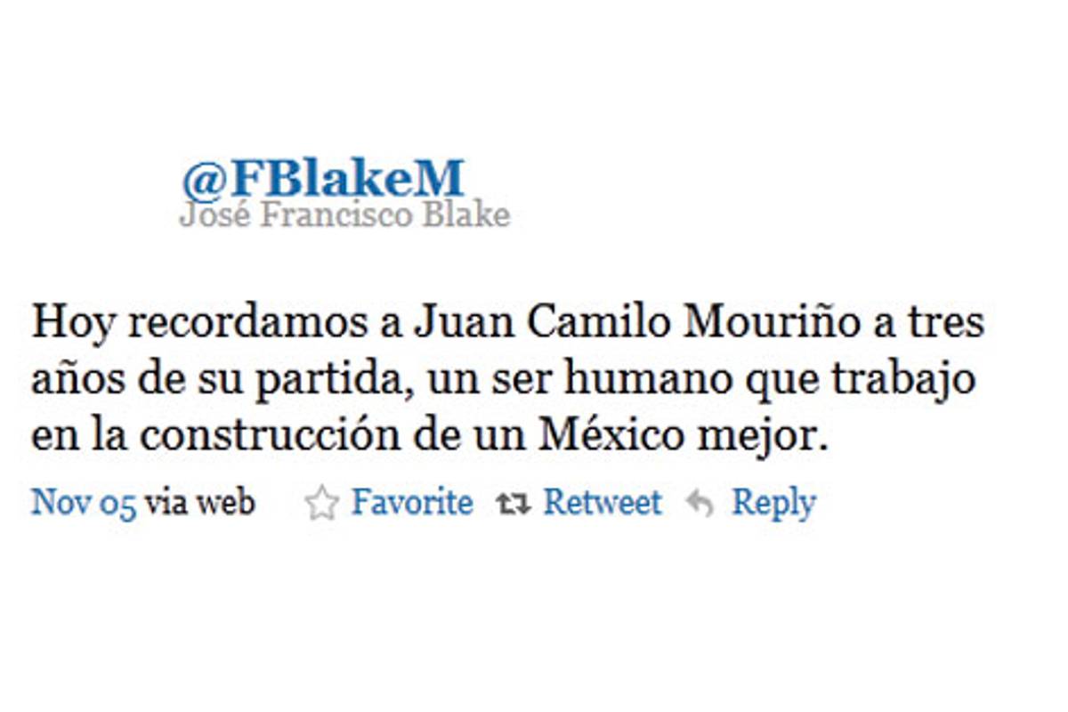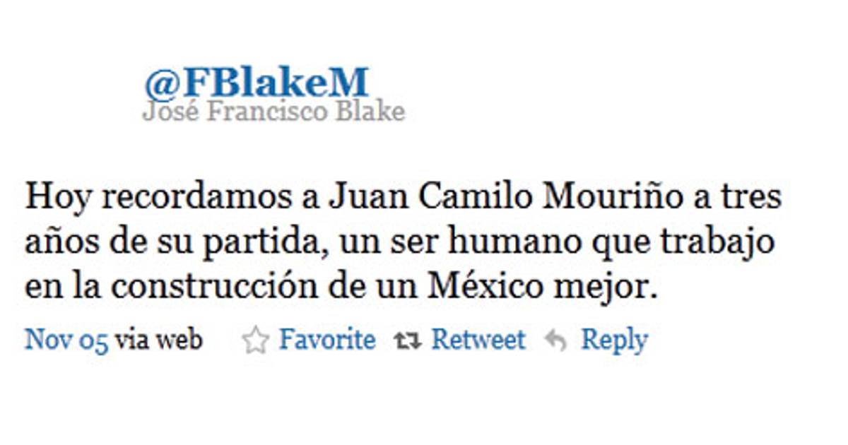 José Francisco Blake Mora, Secretario de Gobernación haría uso por última vez de su cuenta en twitter @FBlakeM México el día 4 de noviembre recordando a Juan Camilo Mouriño a tres años de su muerte, quien fuera antecesor de éste y también fallecido en un accidente aéreo en el año 2008.