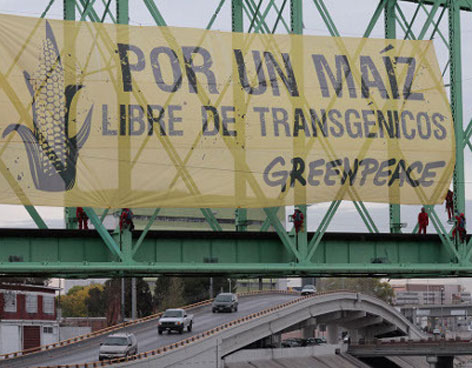 Luego de que al foro "Transgénicos: Impactos en los mercados, el medio ambiente y la alimentación", realizado en el congreso del estado de chihuahua, no acudieran más que dos de los 33 diputados, once activistas descolgaron con rapel una gran manta de 26 metros de ancho por 9 de alto con la exigencia: "Por un maíz libre de transgénicos".