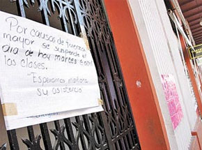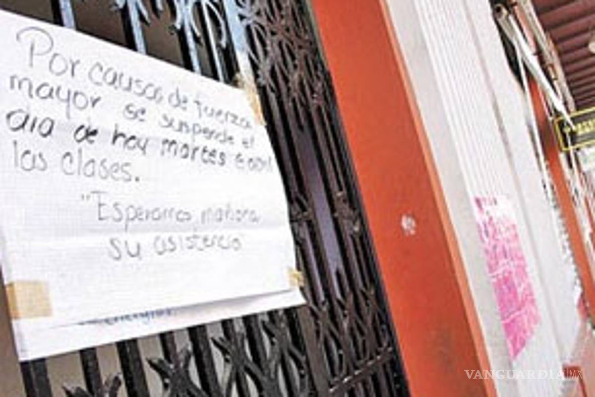 Aviso de suspensión de clases en un plantel de la misma urbe. Hubo un momento en que las dependencias oficiales impidieron salir a los usuarios por los rumores de balaceras que imperaban la ciudad. El centro de esta urbe permanecía tan vacío que por primera vez hacían eco en el Centro Histórico los ladridos de perros de colonias cercanas, como el Cascajal.