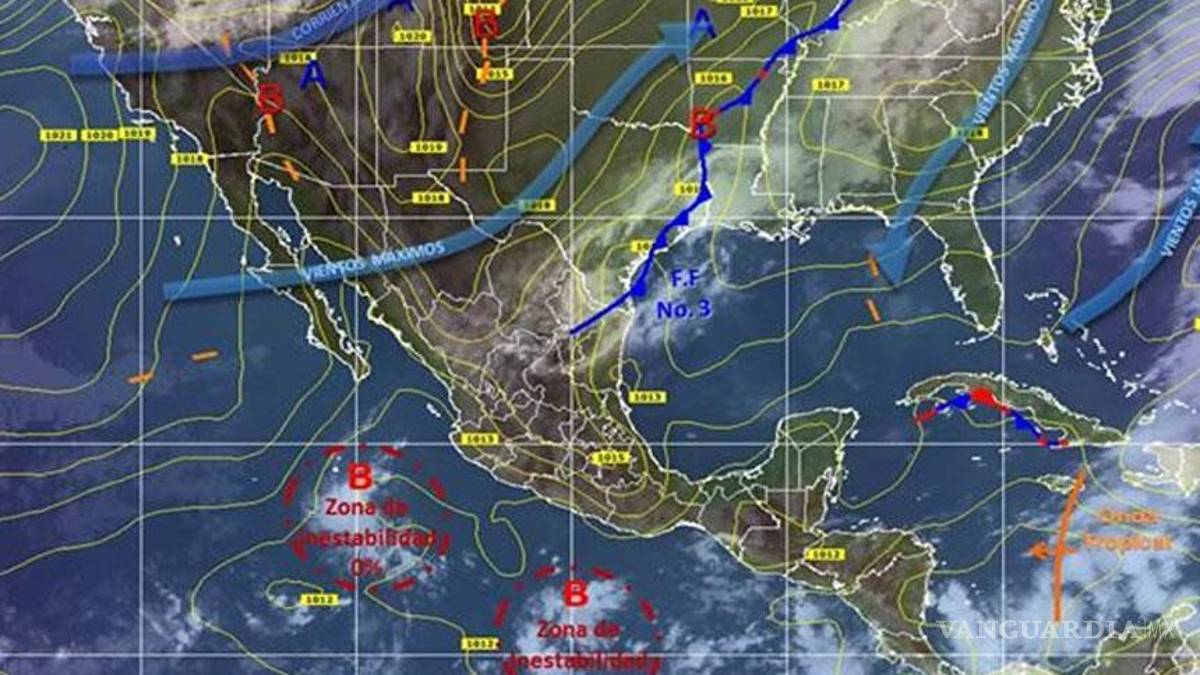 El frente frío número 17, que será reforzado por una masa de aire frío, se desplaza hacia el sureste y generará nublados y lluvias de fuertes a muy fuertes en el oriente y sureste del país