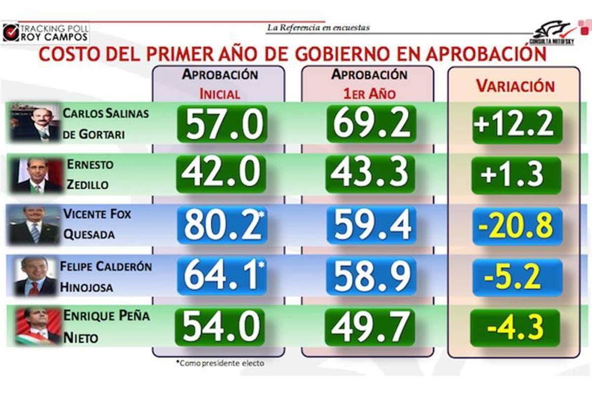 En su primer año de gobierno, la popularidad de Enrique Peña Nieto cayó poco más de cuatro puntos, al pasar de 54% a 49.7% en los últimos 12 meses. En el último trimestre del año, el mandatario suma dos periodos con calificación a la baja, al caer de 57.3% en el segundo trimestre del año -su periodo con mayor aprobación- a 56.2, y finalmente, a 49.7. La medición, hecha por Consulta Mitofsky, muestra un comparativo entre los cuatro antecesores de Enrique Peña Nieto.