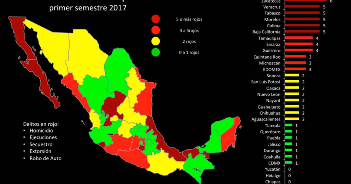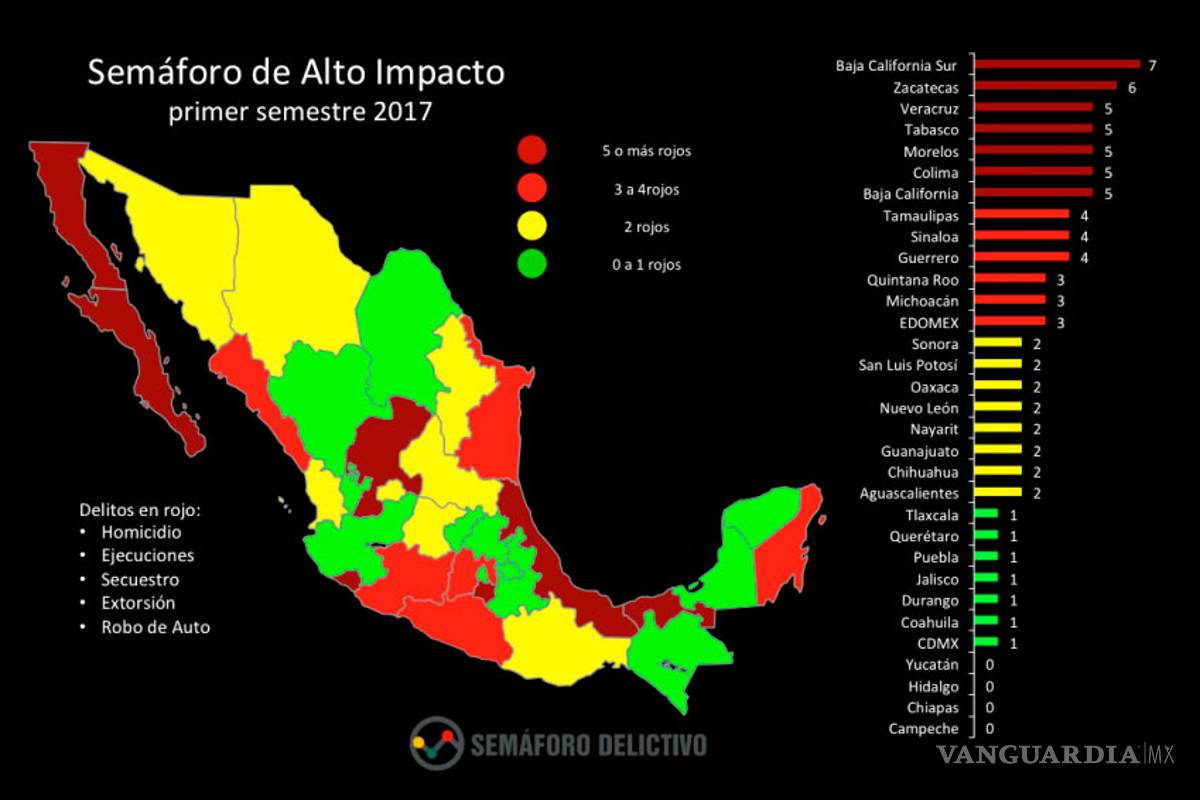 Treinta estados reportan incrementos en el delito de homicidio, la mitad de ellos, con aumentos superior al 30%. Las entidades con las tasas más altas son Colima, Guerrero, las dos Baja California, Sinaloa y Chihuahua, informó la organización